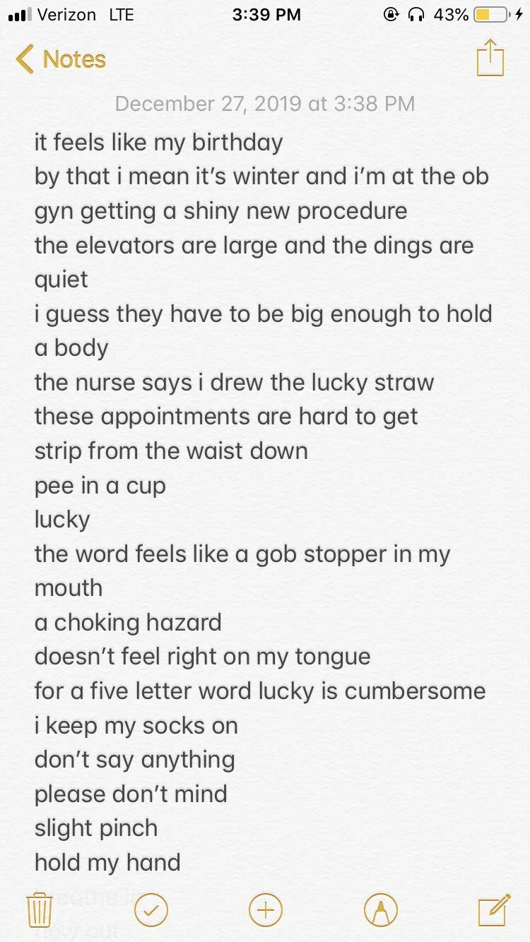As my father drove me to the hospital I gazed at the blurry streetlights. His voice did something I’d never heard it do before, as he told me a story he’d never had the courage to share with me before. “New Year's Day, me and mommy were taking you home from the hospital, and as we took you outside for the first time the gray sky started to flurry. When I looked at you I knew I had never loved anything so much.” I looked over and for the first time in my life I saw my father cry.